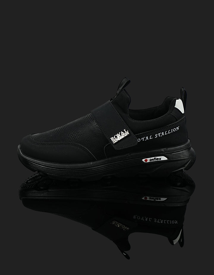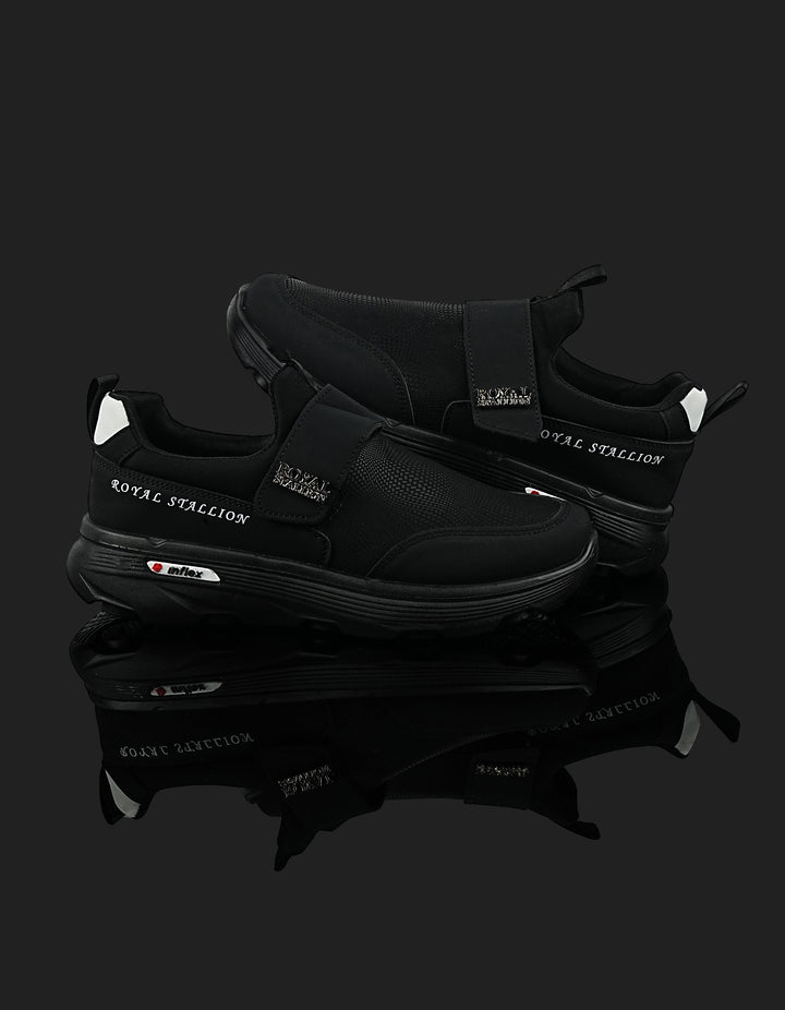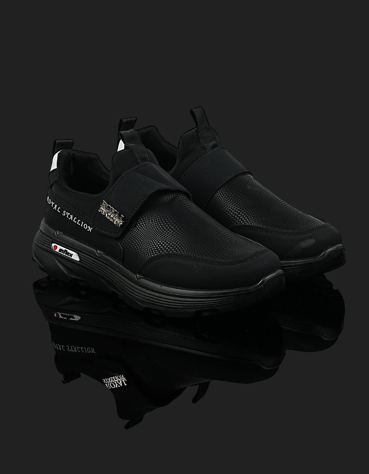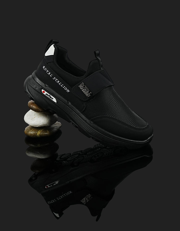 Step into all-day comfort with the K-807 black slip-on shoes by Royal Stallion. Designed for effortless style, these casual shoes feature a breathable textured upper, soft cushioned insole, and flexible outsole. The slip-on construction with a strong velcro strap offers quick wearability, while the sleek black look keeps your outfit sharp.